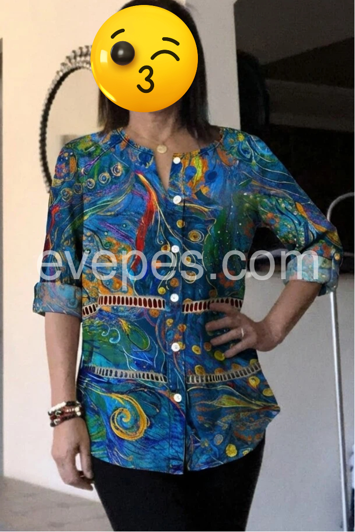 This long-sleeve button-up top features a bold blue base with colorful abstract patterns. The relaxed fit and rolled sleeves add comfort and style. Perfect for casual wear or bohemian outfits. Pair with jeans or leggings for effortless flair. Lightweight fabric ideal for warm days.