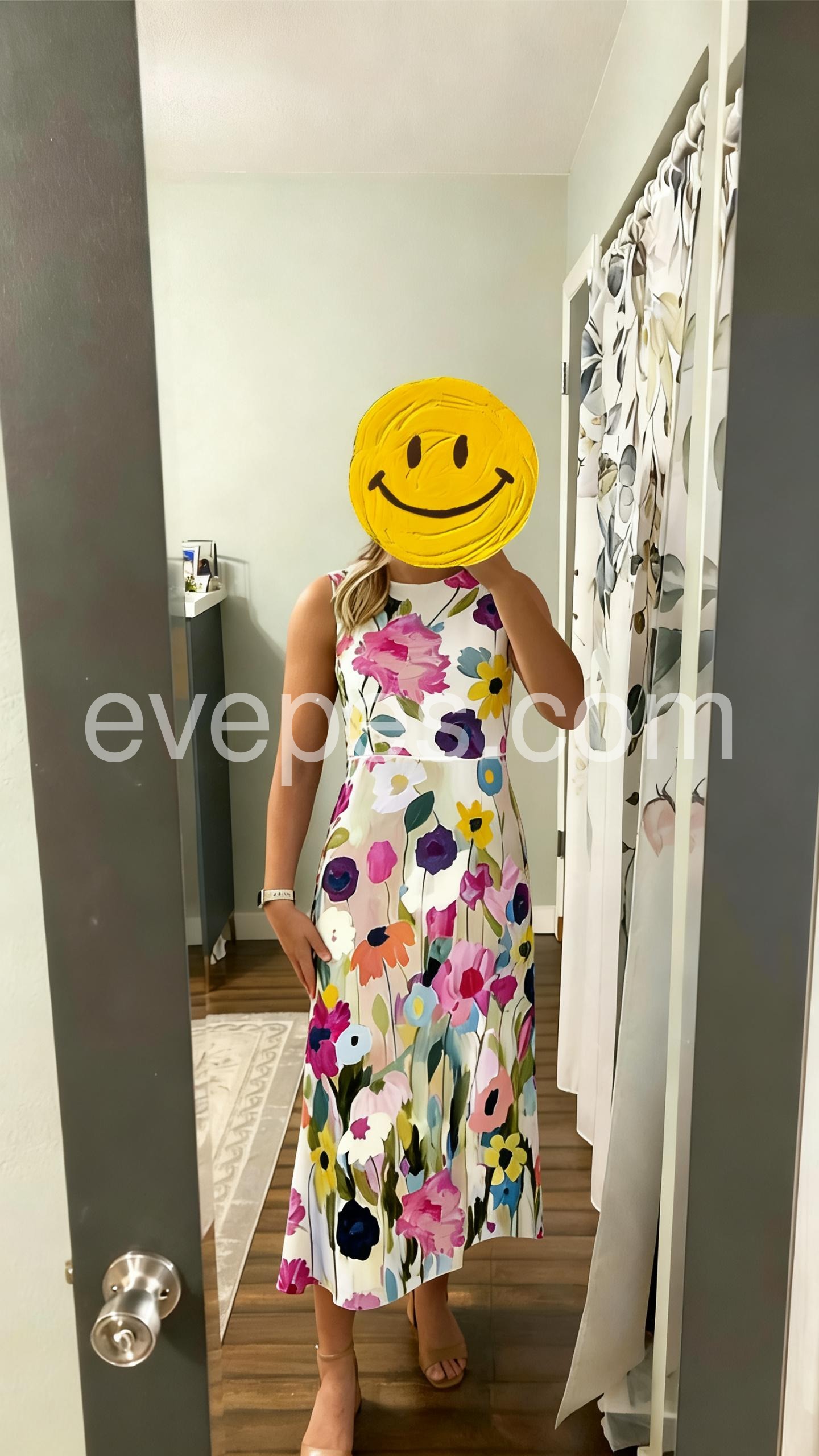This sleeveless midi dress features a vibrant watercolor floral print on a white base. The round neckline and flowy silhouette add elegance. Perfect for summer days or garden parties. Lightweight fabric for comfort and ease. Ideal for beach outings or casual events.